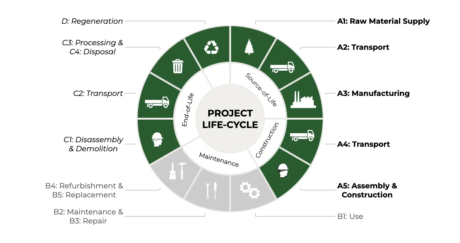 The RESET Embodied Carbon Standard requires the calculation of embodied carbon for the lifecycle stages identified in the Project Boundary.